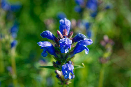 Close-up purple blue flower Hyssopus, common hyssop and grass on blurred natural yellow green floral background in sunlight, summer spring landscape copy space, selective focus