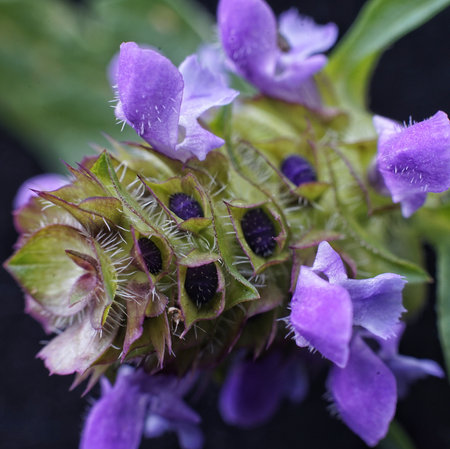 close up of Prunella vulgaris flower, known as common self heal, heal all, woundwort, heart of the earth, carpenters herb, brownwort and blue curls