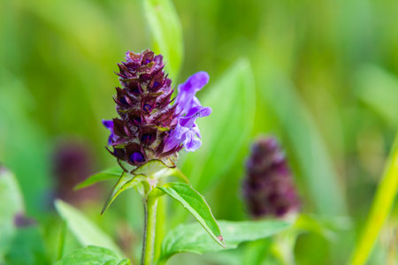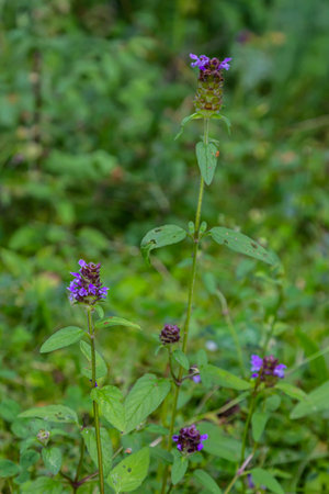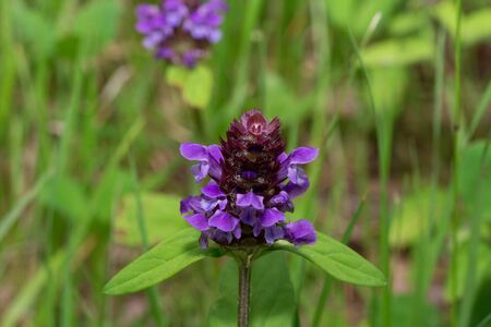 Beautiful prunella vulgaris is growing on a green meadow. Live nature.