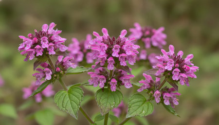 Lamium purpureum blooms in a meadow on a blurred natural background