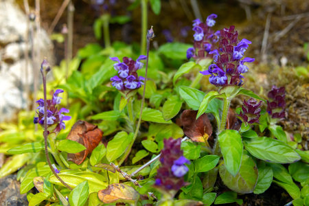 Bright beautiful summer bloom of Prunella vulgaris (self-heal, heal-all, woundwort, or blue curls), creeping bunch with flowers and green foliage growing on rocky terrain.