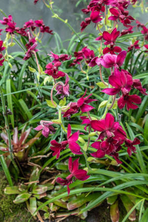 Singapore - March 22, 2019: Gardens by the Bay, the Cloud Forest Dome. Closeup of wine red orchids backed by green foliage.