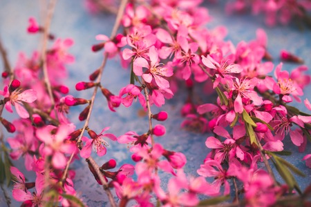 Spring flowering branches, pink flowers on a blue background