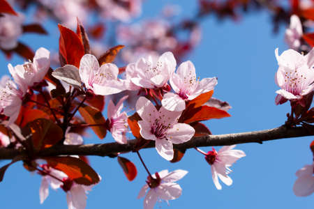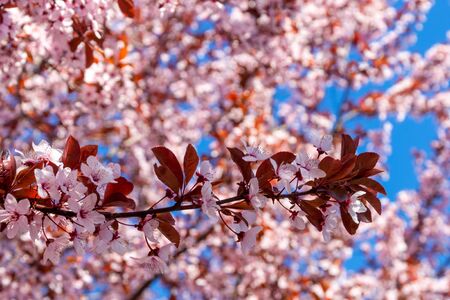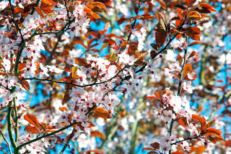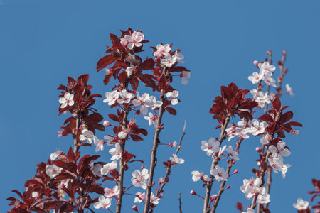 Prunus Pissardii shrub red plum tree in bloom against a blue sky on a sunny day in spring