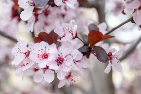 Cherry plum, myrobalan plum, prunus cerasifera branch isolated on blur white background. Pink flowers, purple leafed, ornamental perennial tree or shrub gives fresh aromatic juicy fruits in springtime