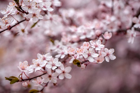 Bloom pink delicate flowers wild cherry on a tree on a warm spring day. Flowers background. warm April weather