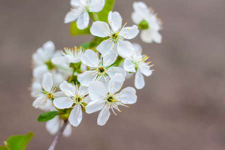 A twig with white flowers. Cherry tree flowers. Macro photography of colors. Selective focus. Blurred background.