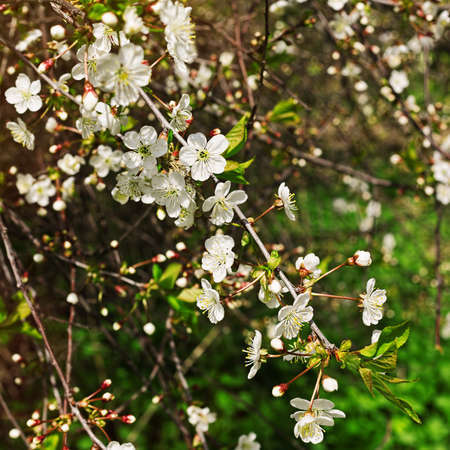 Cherry tree blossoming flowers with soft petals on natural floral background