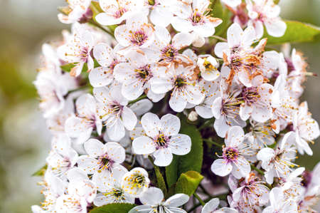 Close-up blooming cherry plum branch in defocus. Selective focus