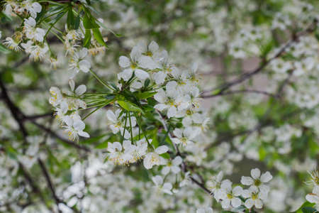 Cherry white flowers on a tree branch. Flowering season. Selective focus