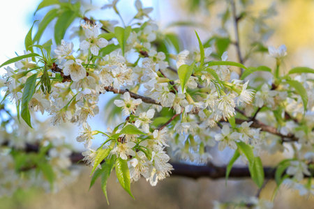 Close up branch of White cherry blossom at Khunwang, Chiangmai Province, Thailand.