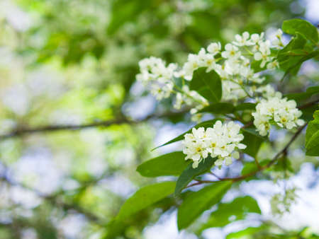Bird cherry blossom. Lush white flowers in spring. Fresh green tree leaves.