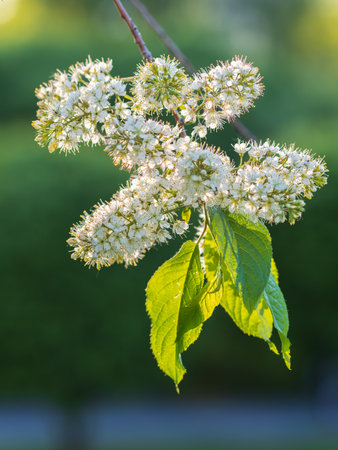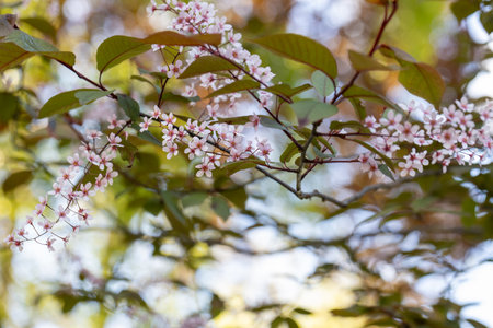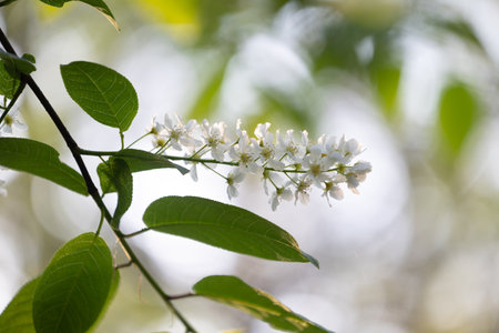 An elegant branch with young green leaves and bloomed in spring white flowers of bird cherry trees, illuminated by warm sunlight.