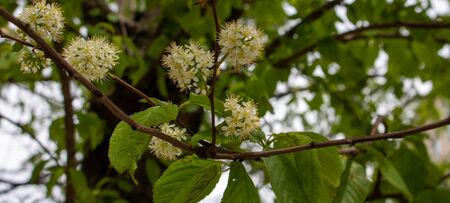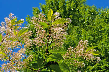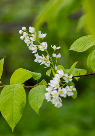 Hackberry flowering brunch, Prunus padus. Bird cherry blossom branch