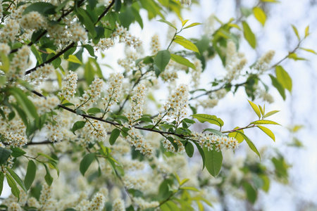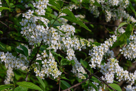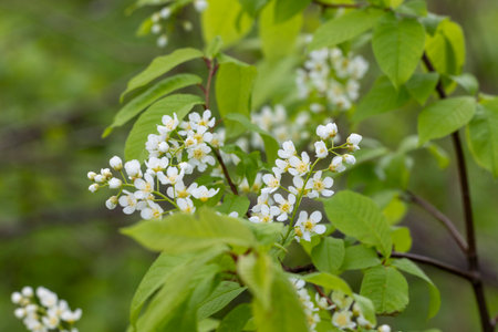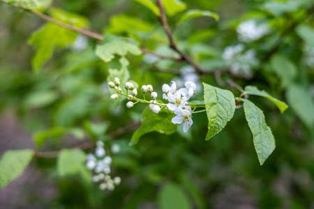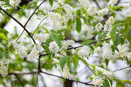 White flowers of bird cherry tree blooming in springtime. Drooping racemes with strong scent flowering prunus padus of rosaceae family. Used anti inflammatory and phytoncidal agent
