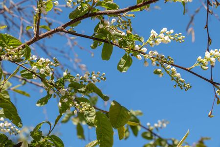 Bird cherry branches with white flowers on a background of blue sky. A fluffy branches of blooming bird-cherry tree, Prunus padus, on a sunny spring day in front of blue sky background