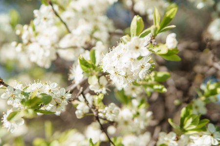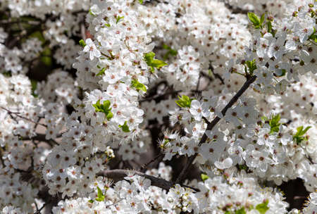 Blooming cherry branches with white flowers close-up, background of spring nature. Macro image of vegetation, close-up with depth of field.