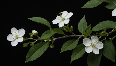 A branch of a cherry blossom tree is captured against a deep black background in this studio shot. Several white flowers, characterized by their delicate, layered petals and bright yellow centers, are in bloom. Green leaves and a few unopened buds are interspersed along the textured woody stem. The dark backdrop effectively isolates the floral emphasizing their natural beauty, freshness, and the subtle details of their form. The conveys a sense of serene and pure natural elegance.
