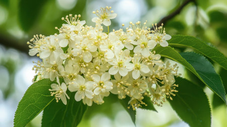 A close-up view of delicate white blossoms surrounded by vibrant green leaves, capturing the beauty of nature in soft, natural light. Perfect for spring themes.