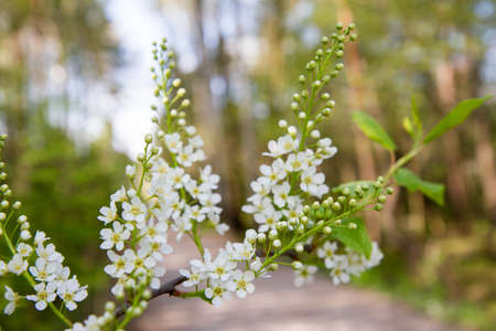 Beautiful white bird cherry flowers in the spring parkand bush. Natural springtime scenery in Latvia, Europe.