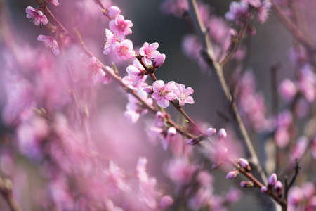 Delicate pink plum blossoms in gentle sunlight, showcasing spring's vibrant beauty.