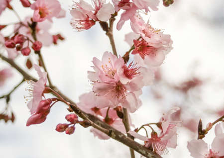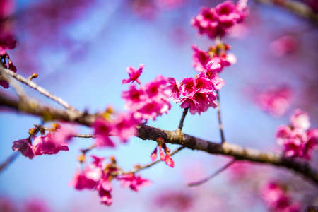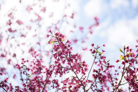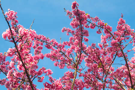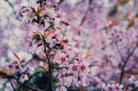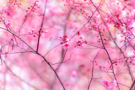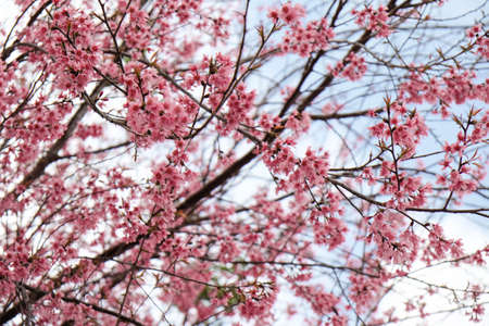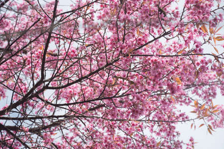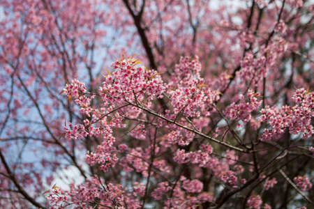 Thai Sakura flower background in winter season on tree, prunus cerasoides at Chaing mai Province, Thailand.