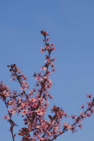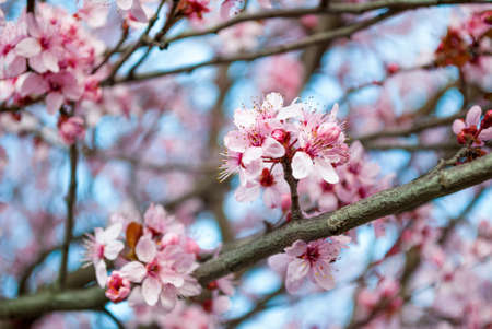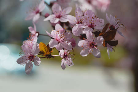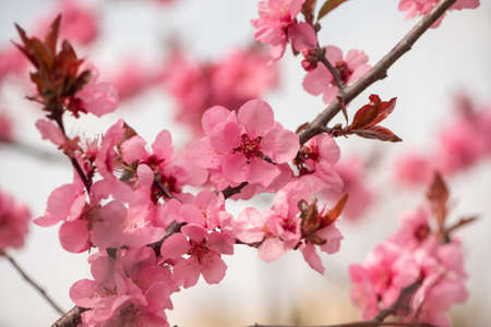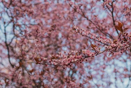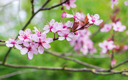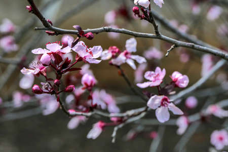 Pissardi plum tree blooming with pink flowers. Selective focus. Blurred background