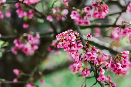 wild himalayan sakura cherry blossom flower. blooming pink flora tree in park. Prunus Cerasoides