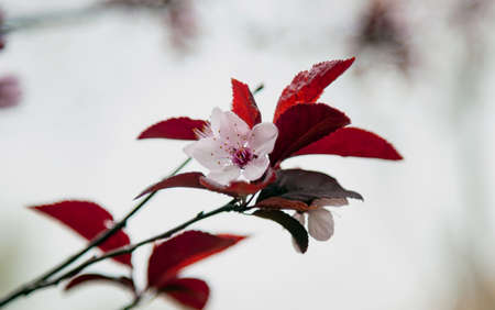 Cherry plum, myrobalan plum, prunus cerasifera branch isolated on blur white background. Pink flowers, purple leafed, ornamental perennial tree or shrub gives fresh aromatic juicy fruits in springtime