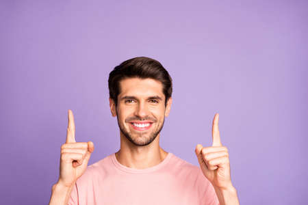 Close-up portrait of his he nice attractive cheerful cheery content bearded brunet guy wearing pink tshirt pointing two fingers up follow like isolated on violet purple lilac pastel color background