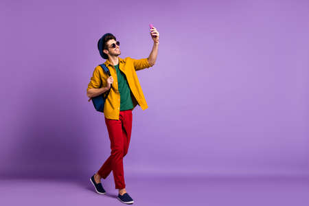 Full body profile side photo of positive guy tourist blogger go walk make selfie using smartphone wear modern casual style clothing over purple color background