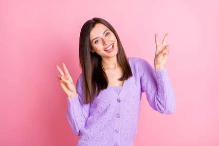 Portrait of optimistic girl show v-sign wear lilac sweater isolated on pink color background