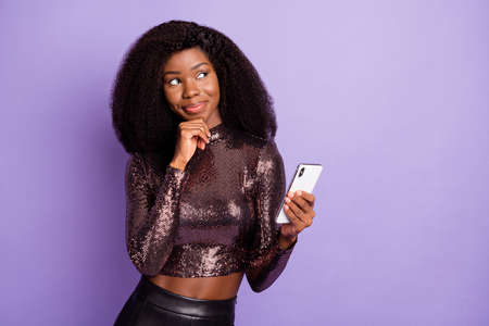 Photo of african girl hold phone look empty space finger chin wear glossy shirt isolated violet color background