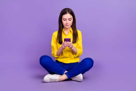 Portrait of beautiful trendy focused girl sitting using device smm post isolated over bright violet purple color background