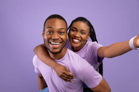 Black couple taking selfie, woman riding on guys back