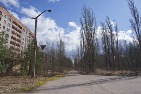 Tall poplars on the central street of Pripyat. Ghost town in the Chernobyl exclusion zone. Landscape.