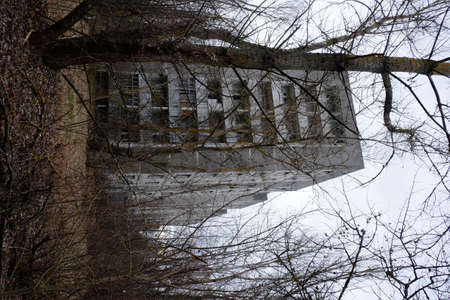 ruins brick house with broken windows and trees in the abandoned city of Chernobyl Ukraine in autumn