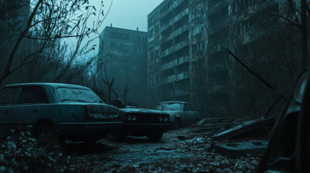 Desolate urban landscape featuring decayed buildings, rusted cars, and overgrown vegetation, evoking a post-apocalyptic or war-torn environment.