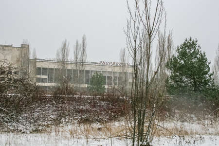 Pripyat, Ukraine - April 25 2019: Inscription Palace of Culture Energetik . Abandoned building in Pripyat. Sign Energetik on the roof of the building. Exclusion Zone, Chernobyl, Pripyat