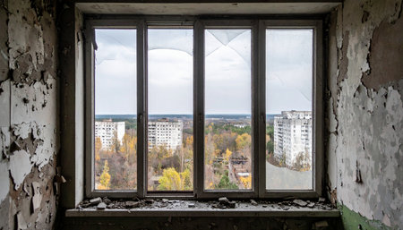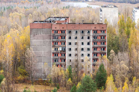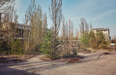 Chernobyl exclusion zone with ruins of abandoned pripyat city zone of radioactivity ghost town.
