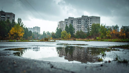 The silent, abandoned apartment blocks of Pripyat stand as haunting monuments to a past tragedy. Their decaying facades are reflected in a still puddle on the cracked asphalt, a somber mirror to the desolation of the Chernobyl Exclusion Zone under a heavy, grey sky.