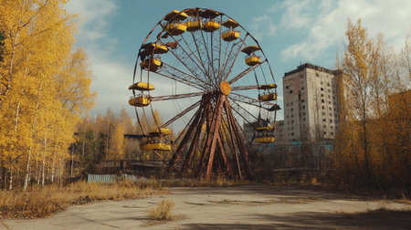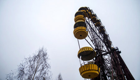 A low-angle view captures the haunting silence of the iconic abandoned Ferris wheel in Pripyat. A stark symbol of the Chernobyl disaster, its rusted yellow cabins stand motionless against a bleak sky, a poignant reminder of a city frozen in time.