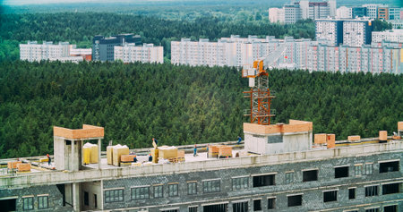 Construction Crane Is Involved In Construction Of A New Multi-storey Residential Houses. Crane At Work. Construction And Development Of New Multi-storey Residential Buildings. Real Estate Buildings