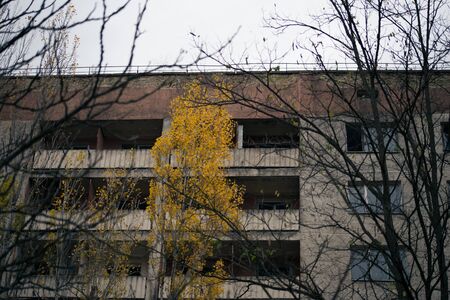 Abandoned ghost town Prypiat. Overgrown trees and collapsing buildings. Pripyat, Chornobyl exclusion zone.