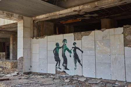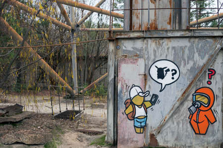 Pripyat, Ukraine - April 25 2019: Old abandoned buildings in the center of Pripyat. Art graffiti on the walls.
