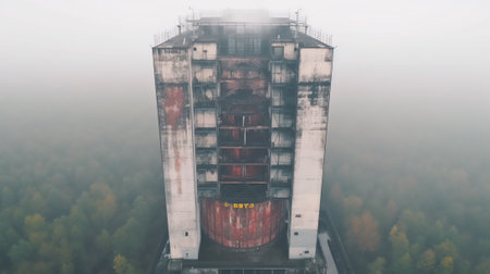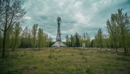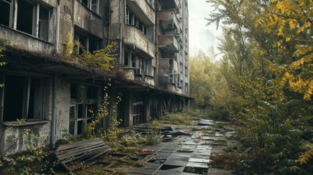 Generative AI Abandoned buildings in Pripyat, Chernobyl, decaying structures, overgrown with vegetation, eerie atmospheric tones, detailed linework