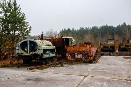 Old rusty abandoned damaged trucks in Chernobyl exclusion zone, Ukraine