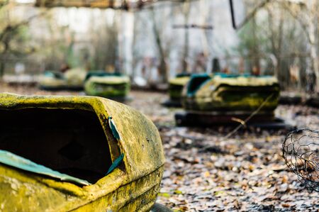Former amusement park with bumper cars in Pripyat, the ghost town in the Chernobyl Exclusion Zone which was established after the nuclear disaster