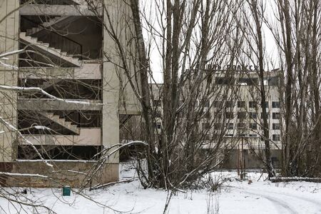 Abandoned building in Pripyat. Old buildings in the Chernobyl resettlement zone.