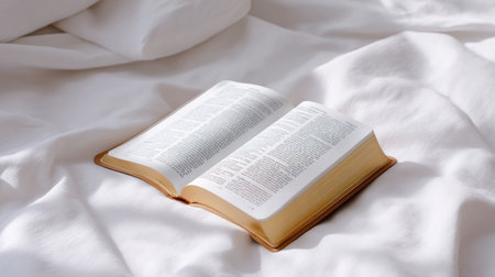 An open book rests on a soft white bedspread, inviting readers to dive into the pages. The scene embodies tranquility, perfect for relaxation and contemplation.